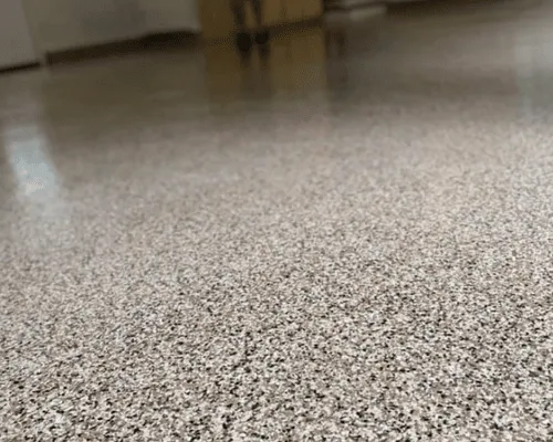 Polymer-based flakes are then broadcast across the floor using 3x as much flakes as required to ensure all areas are covered generously and evenly.