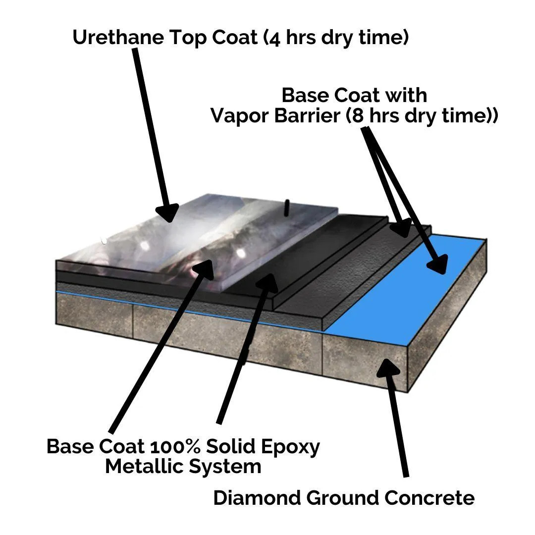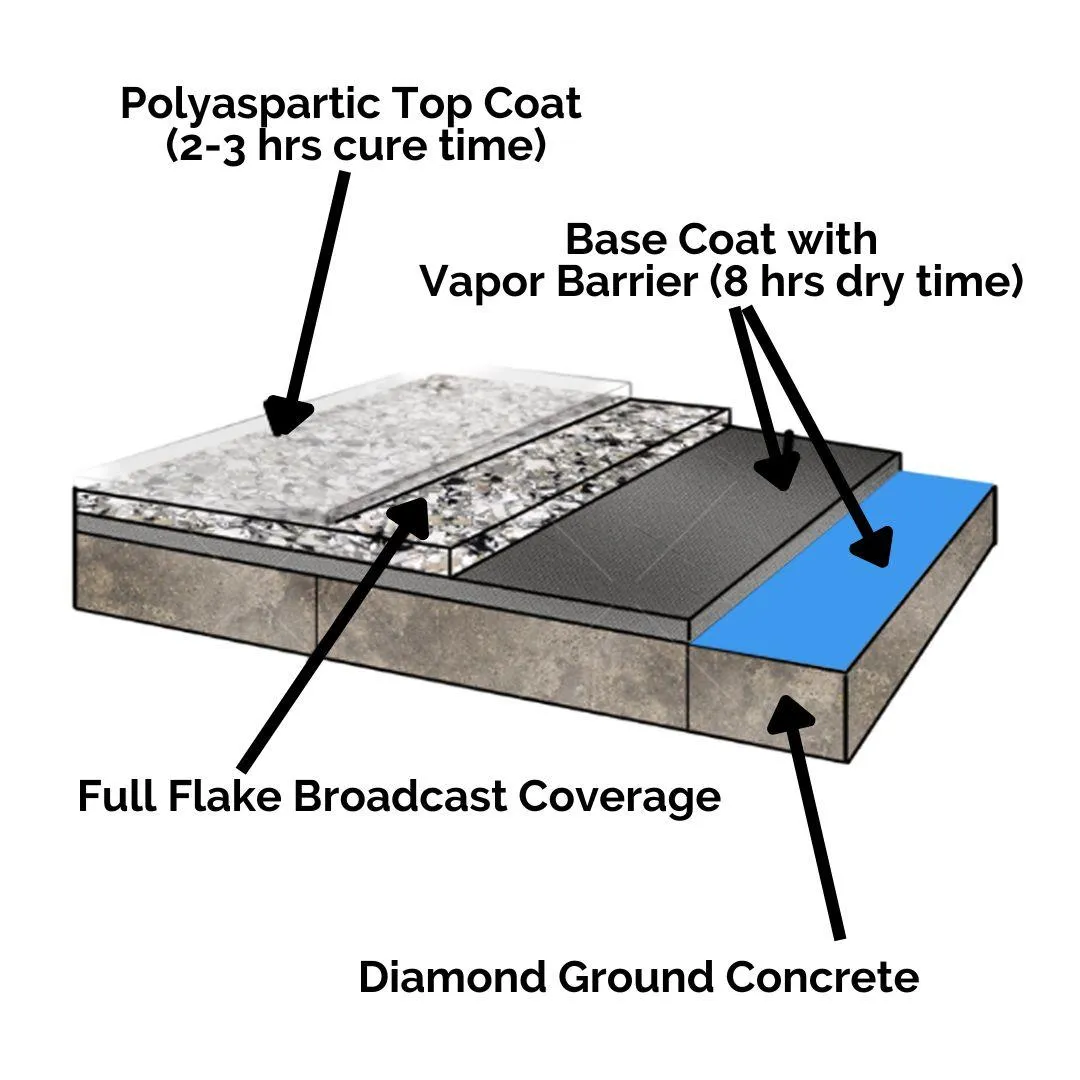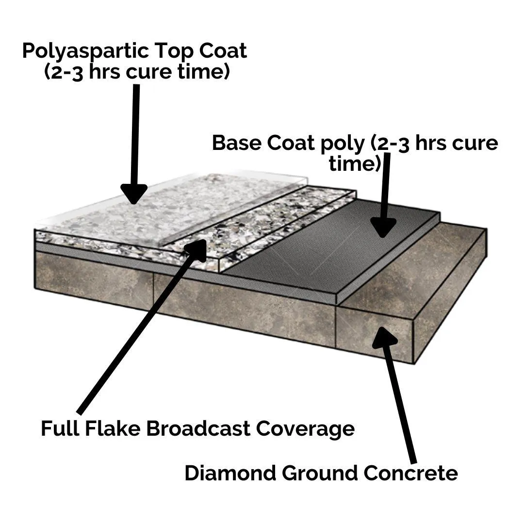 Using the Polyaspartic system as the top coat, this industrial grade polymer coating is the strongest system that can be used. It's also 100% UV proof. You'll be ready to move back in within 24 hours!